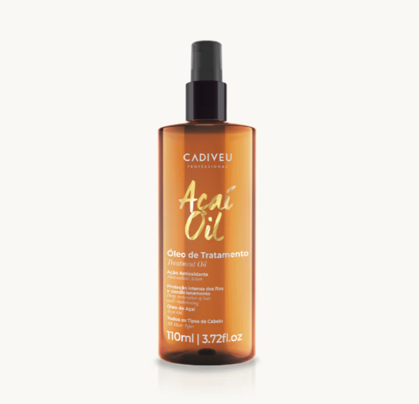 Cadiveu Professional óleo de tratamento Açai Oil é um finalizador em óleo versátil e multifuncional. Sua fórmula restaura de nutre os cabelos danificados e sela as pontas duplas. Possui proteção térmica, e garante maciez, brilho e flexibilidade para os cabelos mantendo os fios leves e macios.