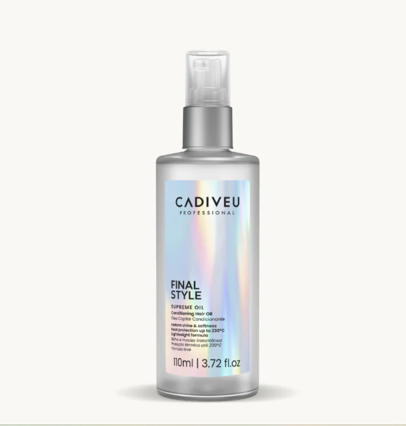 O Óleo de Tratamento Condicionante Cadiveu Professional Final Style Supreme Oil sela as pontas duplas e promove cabelos instantaneamente macios, brilhantes e sem frizz. Sua fórmula é enriquecida com o precioso Óleo de Rosa Mosqueta que entrega uma dose de brilho e maciez aos fios.